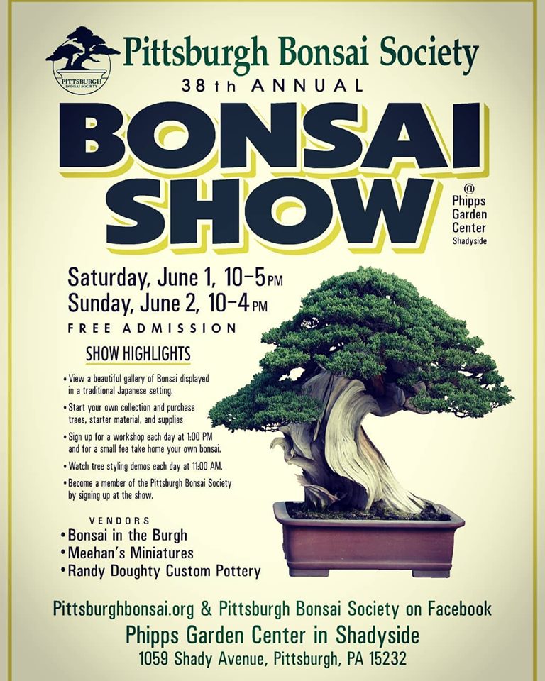 The pennsylvania bonsai society. Remember to call bob dietz from bonsai in the burgh 724 348 4771 for all of your bonsai supplies and he can bring them to a meeting or you can visit him in south park. The pittsburgh bonsai society founded in 1957 upcoming events.